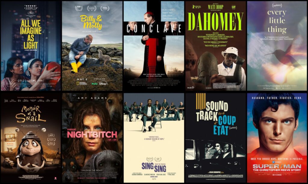 This was another good year for movies, though perhaps not as good as 2023, which saw the release of Past Lives, a film I absolutely adored. As is frequently the case, the bigger-budget extravaganzas, though entertaining, did not quite rise to the level of major cinematic accomplishment for me and so are not here; that said, in my longer list, which I will soon post to my blog, there may be at least one box-office hit there.