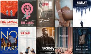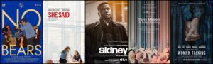 • She Said (Maria Schrader): Based on Jodi Kantor and Megan Twohey’s New York Times investigation into the crimes of now-imprisoned movie mogul Harvey Weinstein, She Said avoids trafficking in the lurid details of sex crimes to instead focus on the resilience of the targeted women. Zoe Kazan (The Big Sick) and Carey Mulligan (Promising Young Woman) star as Kantor and Twohey, and though they each do a wonderful job, it is the many other actors appearing for but brief onscreen minutes as Weinstein’s victims who make the movie soar, their heartfelt, gut-wrenching performances reminding us of the profound human cost of allowing perpetrators to remain unpunished. Quietly powerful, She Said makes us listen through those women’s words, along with the brilliant writing and mise-en-scène.