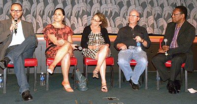 Panel discussion after the film with (l to r) “Freakonomics” producer Chad Troutwine, directors Heidi Ewing, Rachel Grady, & Alex Gibney, and moderator Alvin D. Hall, NPR commentator & host of BBC’s “Your Money or Your Life”