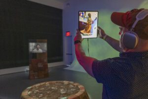 One enters this Augmented Reality (AR) exhibit via the real-world installation that has QR-code-like symbols embedded in the exhibit. One scans them with the provided iPad and suddenly an important African American figure from the past pops up to explain the significance of that spot to Black history. The idea is that soon we will all be able to explore our own particular cities using the Kinfolk app and discover important lessons related to African Americans and their achievements. I live in Baltimore and I expect that there will be much to see here.