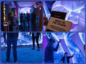 Beyond the gorgeous physical installation that surrounded the viewing space, complete with spongey, convex floor to mimic the experience of standing on a jelly fish, Drop in the Ocean features a beautifully rendered animation of an undersea universe. We are inside the jelly, gazing out at sea turtles and whale sharks. Sadly, we also watch as trash sinks down from the surface, threatening all life below, and learn how climate change poses a serious risk to phytoplankton. If they go, we all go. Still, if this is how we learn about the future death of the planet, at least we have a delightful time doing it.