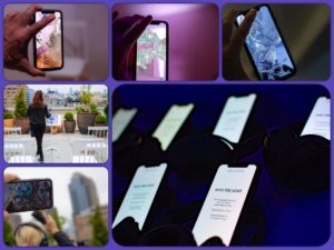 The lone example of AR that I caught, Into the Light leads participants, each holding specially formatted smartphones, on a tour of a space where different locations are geotagged so that artwork by Sougwen Chung appears at those locations when one looks through the smartphone’s screen. Meanwhile, as an audio accompaniment, cellist Yo-Yo Ma plays Bach‘s “Unaccompanied Cello Suite No. 2 in D Minor,” comprised of 6 movements, each movement starting upon arrival at the new location (and activated by scanning a symbol on the wall). When one holds the phone in one way (up), it displays Chung’s art; when one holds it down, a black screen appears, with a white dot that indicates Ma’s position vis-à-vis the phone, and as one moves closer or further away, the volume changes, accordingly. If one moves into the center of Ma’s location, one also hears his heartbeat. This was my first time participating in such an experience. It was captivating, though I wish we had been able to hear the complete suite, rather than just snippets.
