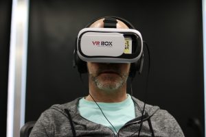 The author watching VR (photo by Brian Ho)