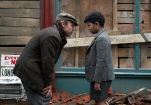 Given the ongoing nightly attacks, Rita and her father, Gerald (singer Paul Weller), decide to send the nine-year-old George off to the countryside, which opening title cards explain was a common practice at the time. The British government organized many trains to evacuate children from the city, and these children would then be housed in the homes of volunteers. George—happy with his mother and grandfather, no matter the danger—does not want to go. Angry at Rita, he runs off at the station, refusing to say goodbye. She is understandably upset.