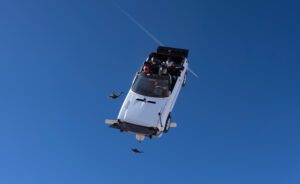 The dramatic through line to which we return, time and again, is Jennings’ attempt to outfit a car with the perfect adjustments so it will fall from the sky without spinning out of control. He hopes to then place four men inside it and thereby capture the wild footage that results. It neither looks easy nor is, in fact, easy.