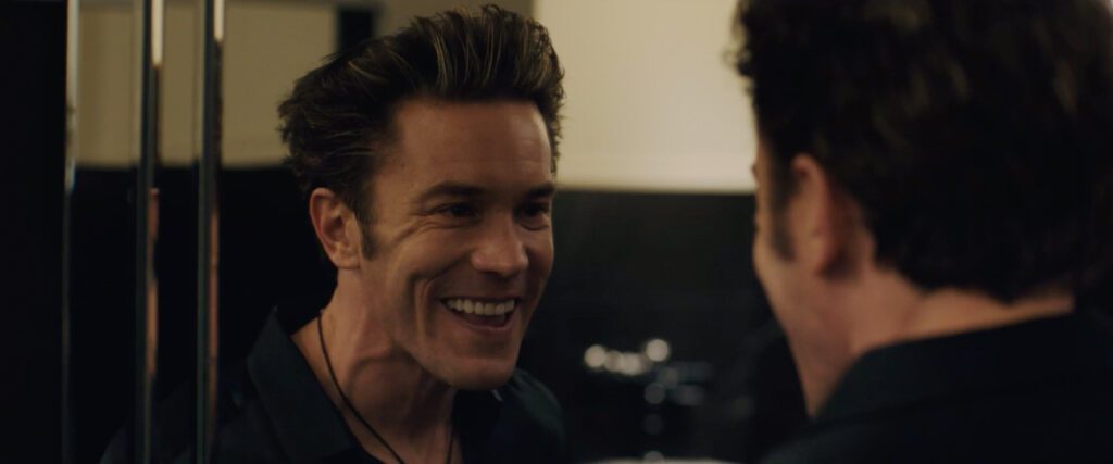 Following his every move, in hindsight, is FBI agent Lance Leising (Ryan Phillippe, The 2nd), attached to the investigation post-shooting. As he works through past events, we catch glimpses of Jason’s high and low points, including interactions with his sister (Shantel VanSanten, Becca Butcher on Amazon’s The Boys), brother (Paul Schneider, A House on the Bayou), mother (Jacki Weaver, Father Stu), father (Kevin Corrigan, Teenage Badass), and Melanie (Idina Menzel, Uncut Gems) a woman who not only leases Jason a house, but becomes his lover. Slowly, a picture emerges of the swindler, and it is not favorable.