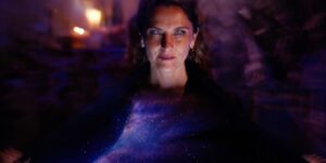 Cosmic Dawn opens, and continues to expose its premise and introduce its characters, in a simplified yet mysterious way, bringing the viewer along with Aurora. Within the first few sequences of the film, Cosmic Dawn establishes beautiful art direction, and the film’s overall psychedelic color schemes are fun and vivid to witness. The Cosmic Dawn’s lair—a remote lodging beneath a set of mysterious, ancient stone relics—has a beautiful aesthetic, and stands as an adequate setting for the majority of the plot (even though much takes place in the woods outside the location).