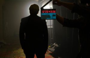Alec Baldwin behind stage for ballroom scene with slate clap in FRAMING JOHN DELOREAN. Courtesy of NICOLE RIVELLI Photographie. A Sundance Selects Release.