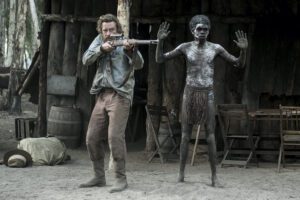 The film begins with a depiction of everyday Arnhemlander life so normal and idyllic that the impending massacre feels heartbreakingly inevitable. Travis, an expert sniper and WWI veteran, sees immediately that at least two of his fellow white men are not interested in a peaceful conversation, and then watches as a full-scale massacre ensues. Women, men and children are shot indiscriminately while Travis races down from his vantage point (his high ground, we might say) to try to stop the killings. He kills one white man who casually asks him, “Did I get her?” after shooting the fleeing mother of a young child. He then finishes off another white man who was fatally wounded by an Arnhemlander spear.