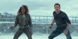 Writer/director Colin Trevorrow (Jurassic World) returns to the helm after allowing someone else to take the reins last time. Also coming back are Bryce Dallas Howard, Chris Pratt, and Isabella Sermon, reprising their roles as Claire Dealing, Owen Grady, and Maisie Lockwood (cloned granddaughter of the guy who created the first park). Since we last experienced this universe, the world has come to terms with the fact that dinosaurs exist and roam free, even if they sometimes prove dangerous or fatal (as evidenced by an opening marine attack).