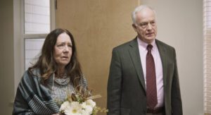 The title has a double meaning, given the location—an Episcopal church with rehearsal services going on above—and the reasons for the gathering. At the start, we first meet Gail and Jay (Martha Plimpton, Honey Bee, and Jason Isaacs, Skyfire), who arrive with great trepidation to finally sit down with Linda and Richard (Ann Dowd, Rebecca, and Reed Birney, The Forty-Year-Old Version), whose therapist, Kendra (Michelle N. Carter) has helped arrange the whole thing. She gets there first, and in a series of everday interactions with church staff (one of whom is played by Breeda Wool, AWOL), inserted, no doubt, to remind us of the ordinary world that goes on no matter the circumstances, prepares the room where the fateful conversation will take place. Finally, the mundanity of setup complete, we get on with the business at hand.