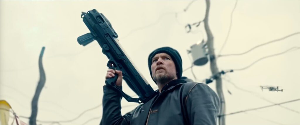 At first there are two parallel stories that don’t appear to connect, yet eventually do. In one, we meet Evan (Robbie Amell, Resident Evil: Welcome to Raccoon City) and Faye (Jordana Brewster, Who Invited Charlie?), a married couple whose onscreen introduction is via an oddly edited sex scene. Next, we have Kessler (Sam Worthington, Avatar: The Way of Water), a detective working for AICE (Artificial Intelligence Compliance Enforcement), in hot pursuit of a rogue, unregistered android named Esme (Alicia Sanz, The Devil Below), who may be linked to an outlaw programmer named Casey (Simu Liu, Shang-Chi and the Legend of the Ten Rings). It’s the near future, and as in so many dramas about humanity’s potential collapse, AI may have it in for us.