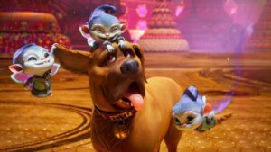 And so the ghosts of Christmas past, present, and future arrive, one after the other, each revealing to Scrooge that which he has done, is doing, and will do. Olivia Colman (The Lost Daughter) and Trevor Dion Nicholas voice the first two, while the third never speaks, transitioning from the playfulness of its predecessors to become a gloomy, frightening presence leading Scrooge to his unhappy end. Along the way, there are scenes both goofy and poignant, featuring: the lovable canine companion Prudence, rambunctious playmates to the middle ghost known as Cheerlings, and one very lovelorn former fiancée to Scrooge named Isabel (Jessie Buckley, Women Talking).