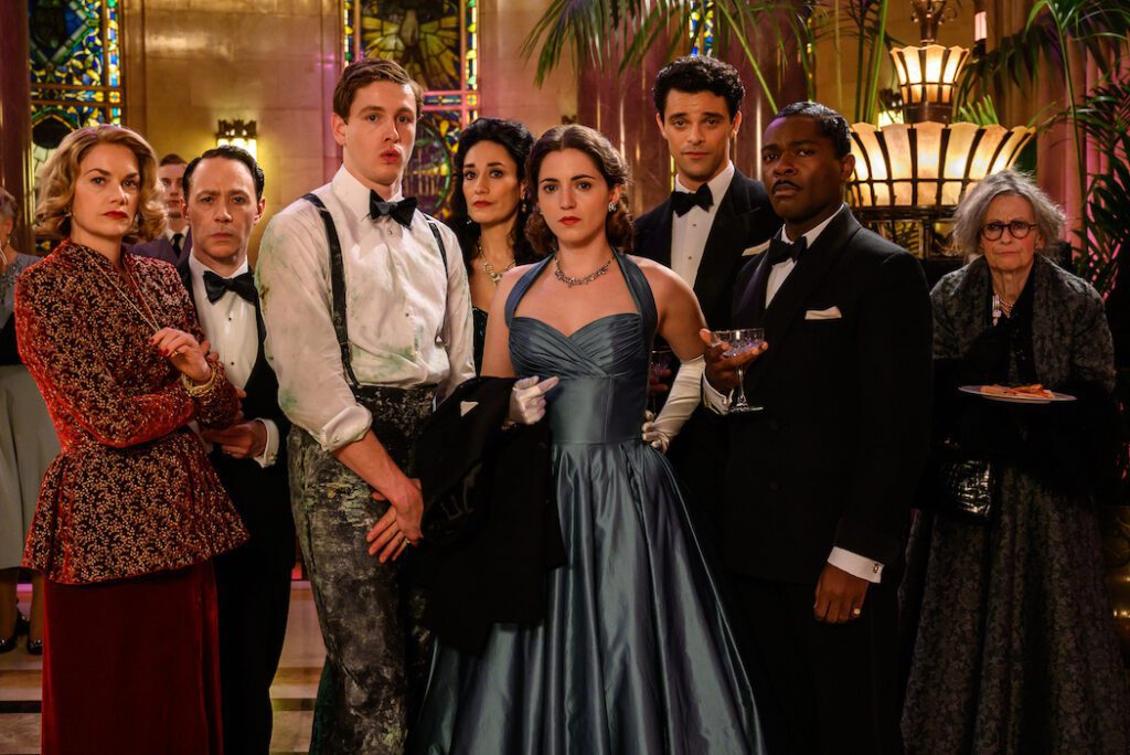George and Chappell fill the movie with a mix of real-life and made-up characters, among the former married actors Richard Attenborough (Harris Dickinson, Where the Crawdads Sing) and Sheila Sim (Pearl Chanda, Marionette)—who were in fact part of the group that first performed in The Mousetrap—and among the latter screenwriter Mervyn Cocker-Norris (David Oyelowo, The Midnight Sky), tasked with working with Kopernick (not a happy union). The clash of personalities is meant to remind us of the many similar dynamics in Christie’s own novels (or in the play) but is instead mostly just tiresome. By the end, though we’ve had some good moments, it’s more than time to run on home.