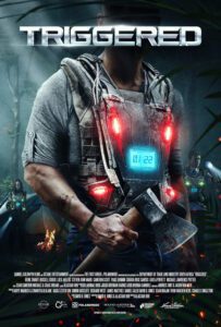 Triggered begins with an older man strapping a high-tech vest onto someone in the middle of the woods. Then, the film cuts to a group of nine friends sitting around a campfire. They chat about typical young-adult drama, but more so than usual. The tensions between members of the group are evident from the get-go, which makes things more intriguing later. After going to bed, they all wake up in the middle of the night with unbreakable bomb vests strapped to their chests. These technologically advanced vests feature lights and a timer to illustrate the countdown to detonation: blue means you have the most time left out of everyone; green means you have a decent amount left; and red means you have the least amount of time. Each person is given a different time on their vest, and when the timer hits zero … BOOM, the vest explodes. However, they soon find that it is possible to increase the amount of time a person has left … by killing someone else. Will the so-called friends work together to find a solution, or will they turn on each other to increase the time on their own vests?