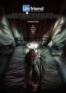 To be fair, there are a few narrative surprises amidst the unintentional, awkward hilarity of the thing, and if one likes the campy pleasures of horror for their own sake, then give it a whirl … when it arrives for home viewing, free of charge. But beyond those few dollops of whoop-de-do, Friend Request fails in its most basic duty to entertain. Nothing makes even a modicum of sense, so it’s usually impossible to enjoy the silliness of it. Dumb is not the same as dumb fun. The film’s original title was Unfriend (see poster, below). Whoever made the change probably understood how off-putting that sounds, choosing, instead, to beg for your love. Follow the lead of that first appellation … and beg off.