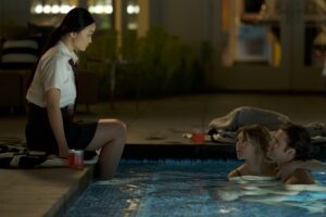 That difference becomes even more apparent once Lynn meets Bank (Jabari Banks, Peacock’s Bel-Air series), a fellow prodigy and first-generation teen from Nigeria. Like Lynn, Bank suffers from serious generational guilt, but he is more willing to keep his head down if it helps him get a college scholarship. Years of being put on a pedestal have given Bank a more cynical outlook on Exton. Faculty members celebrate him for his intelligence, but he feels like he is only there to rake in cash from school donors. Jabari Banks’ performance grounds the film, and reminds viewers that consequences differ among Americans, even if they are both children of immigrants.