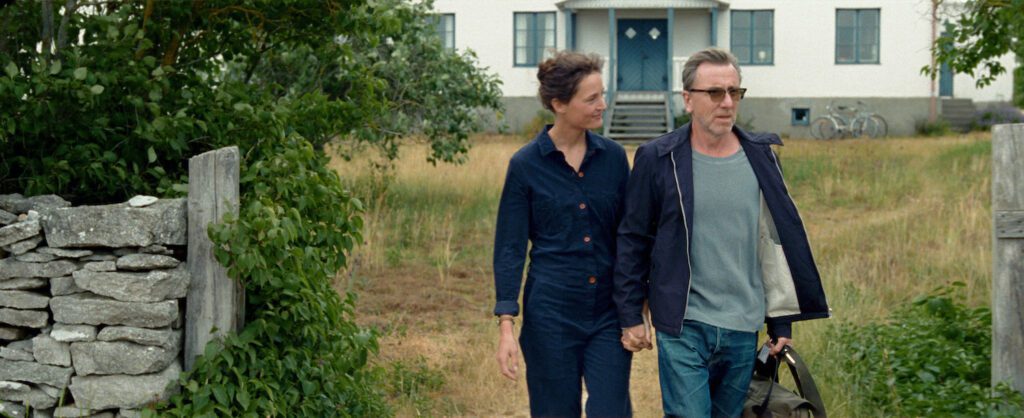 Beautifully rendered and exquisitely cast, Mia Hansen-Løve’s Bergman Island takes us to Fårö Island, just north of Gotland Island, both of which lie south of Stockholm, Sweden, in the Baltic Sea. We journey in the company of Chris (Vicky Krieps, Phantom Thread) and Tony (Tim Roth, Luce), a filmmaker couple making a pilgrimage of sorts to the home of one of their favorite directors. That would be Ingmar Bergman, who lived and worked on Fårö, setting many of his movies there, starting with the 1961 Through a Glass Darkly. Tony is the older and more famous of the visiting duo, and has in fact been invited to present some of his best-known works. Both he and Chris hope to write while they are there, each finding a separate space on the property they have rented, which just happens to be the house used in the 1973 Scenes from a Marriage. As the woman showing them the place reminds them, that’s “the film that made millions of people around the world divorce.” Seems like heavy foreshadowing.