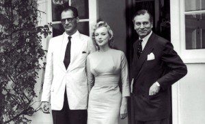 !10! bew keystone fot.keystone-france k005798 07/14/1956. Surrey, Great Britain. The American starlett Marily MONROE posing with her new husband the dramatist Arthur MILLER (left) and Laurence OLIVIER (right). They are on the frontsteps of Englefield Green house where the young couple spent their honeymoon. Marilyn MONROE and Arthur MILLER married on July 5 in White Plains and came to London for their honeymoon and for the filming of Laurence’s film THE PRINCE AND THE SHOWGIRL.