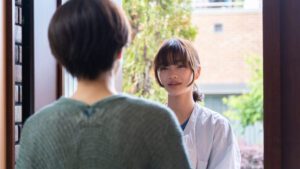 First on screen is Chizu, whose life has taken a turn for the quiet since she was laid off from her job as a kimono dresser. We follow her as she seeks new work and then travels to see an old friend, encountering a former colleague along the way. As she stops to attempt to help some children who have lost something up a tree, we suddenly cut to Sanae, observing Chizu’s efforts. From there, it becomes her story.