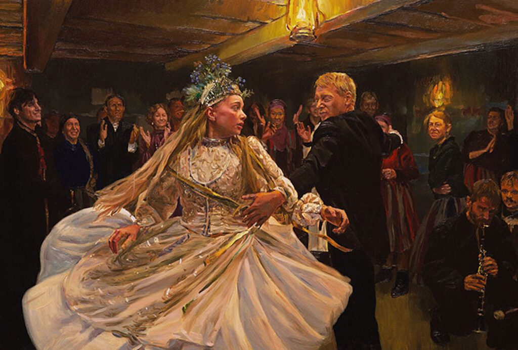 The Peasants’ retelling of the novel is a competent endeavor, but any notable uniqueness is found only in its bold visual style. Here, the directors return to the concept of painterly daydreaming: imagine you are walking in a spacious art museum; you turn the corner and walk up to a framed oil painting of a young bride dancing with her new husband, who is thirty years older, and they are surrounded by the twenty-eight other people of their village. The scene is so vivid that you could walk straight into the painting and watch how the rest of the bride’s life plays out.