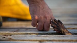 Billy’s finger touching Molly’s paw as it pokes through the gaps in the jetty. @National Geographic/Johnny Rolt
