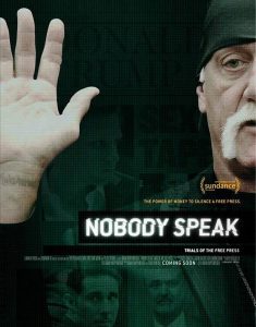 A profound work of investigative journalism and an essential film for our current era, Nobody Speak: Trials of a Free Press focuses primarily on the lawsuit brought by wrestler Hulk Hogan against Gawker Media, in which Hogan (born Terry Bollea) was awarded $140 million in damages, enough of a sum to force that company into bankruptcy. What starts out as a standard documentary procedural, however, soon becomes an exposé on how the rich and powerful in our country are attempting to silence the fourth estate. Hogan, it turns out, was not working on his own. Peter Thiel, a Silicon Valley entrepreneur who years earlier was outed as gay by a Gawker subsidiary, had long nursed a grudge, biding his time until the right moment would arise to kill the company. We can hate much of what Gawker, sleazy online tabloid that it was, did, but still grant that it had every right to publish its stories, and understand that its defeat in court bodes ill for the future of the First Amendment of our Bill of Rights. If a free press is essential to democracy, does this presage a slide towards control of the media by billionaires? Let’s hope not, but based on what we see in Knappenberger’s brilliant, if frightening, movie, it’s a distinct possibility.