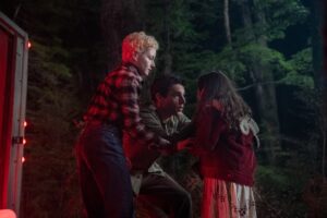 Our protagonist is Blake Lovell (Christopher Abbott, Sanctuary), a former writer turned stay-at-home dad living in New York City with his family. His wife Charlotte (Julia Garner, The Assistant) is a journalist and aspiring author, and the two are raising a young daughter named Ginger (Matilda Firth). One day, Blake receives word that his father, Grady (Sam Jaeger, The Eyes of Tammy Faye), has been legally declared dead, and so he must return home to Oregon to settle his affairs. Blake sees this as an opportunity for the family to bond, so the three drive cross-country for a summer road trip. As they arrive, they’re attacked by the titular Wolf Man, who scratches Blake before they can escape. Now, the family must survive the night with one Wolf Man hunting them and another beside them.