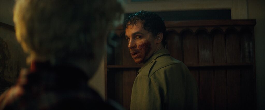 Our protagonist is Blake Lovell (Christopher Abbott, Sanctuary), a former writer turned stay-at-home dad living in New York City with his family. His wife Charlotte (Julia Garner, The Assistant) is a journalist and aspiring author, and the two are raising a young daughter named Ginger (Matilda Firth). One day, Blake receives word that his father, Grady (Sam Jaeger, The Eyes of Tammy Faye), has been legally declared dead, and so he must return home to Oregon to settle his affairs. Blake sees this as an opportunity for the family to bond, so the three drive cross-country for a summer road trip. As they arrive, they’re attacked by the titular Wolf Man, who scratches Blake before they can escape. Now, the family must survive the night with one Wolf Man hunting them and another beside them.