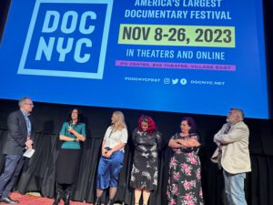 l-r: DOC NYC co-founder Thom Powers, director Rebecca Cammisa, producer Sarah Nörenberg, subject Jada Portillo and her mother Diana, and producer Walter Köhler at the YOURS IN FREEDOM, BILL BAIRD Q&A at DOC NYC 2023. Photo credit Christopher Llewellyn Reed.
